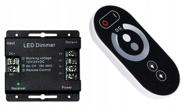 Urządzenie służy do łatwego i szybkiego zarządzania natężeniem światła wszystkich taśm jednokolorowych. Komunikacja między sterownikiem a pilotem odbywa się za pomocą fal radiowych - RF. Zasięg pilota w warunkach otwartej przestrzeni wynosi około 10 metrów. Fabrycznie zaprogramowane funkcje i tryby pozwalają m.in. na zdalne: włączanie i wyłączanie światła, ściemnianie i rozjaśnianie kolorów statycznych. Maksymalny pobór wszystkich podłączonych odcinków taśm LED przy napięciu 12V nie może przekroczyć 216W, w przeciwnym razie instalację należy rozszerzyć o wzmacniacze sygnału lub ściemniacz o większej mocy. Urządzenie zachowuje także w pamięci ostatnio używaną kombinację - tzw. funkcja "power off memory" umożliwia wyświetlenie tego samego programu po ponownym włączeniu sterownika / odcięciu zasilania.